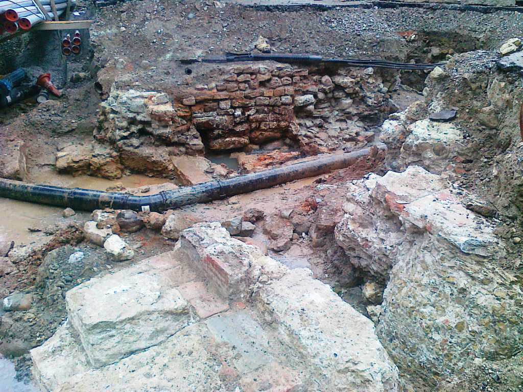 Die Baugrube öffnet sich ostwärts in Richtung ehemaliges Freibad und Heisser Stein Quelle. Am Standort der gefällten Linde auf dem Kurplatz erscheinen weitere Mauern bisher unbekannter Bauten. Im Vordergrund die Nord-Ost-Ecke des Verenabades. In Bildmitte eine neu verlegte Thermalleitung. Gemäss Mitteilung der Stadt Baden wird die Leitungsführung angepasst, um die Funde im Untergrund nur in minimalster Weise zu tangieren.