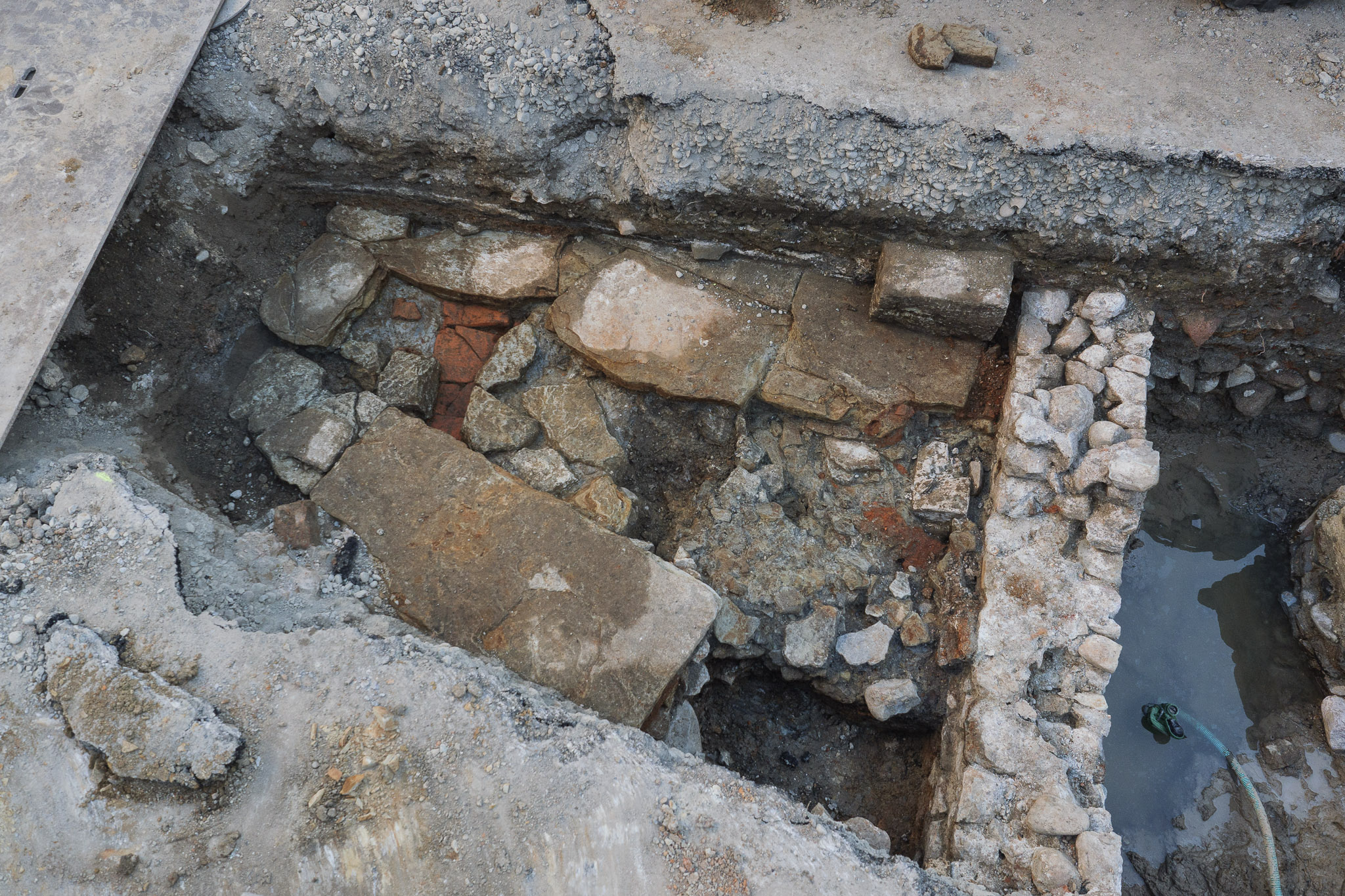 Einzelne römische Schichten wurden bereits entfernt. Teile der römischen Becken wurden wieder zugeschüttet. Neue Leitungen führen mitten durch die Grabungsstätte.