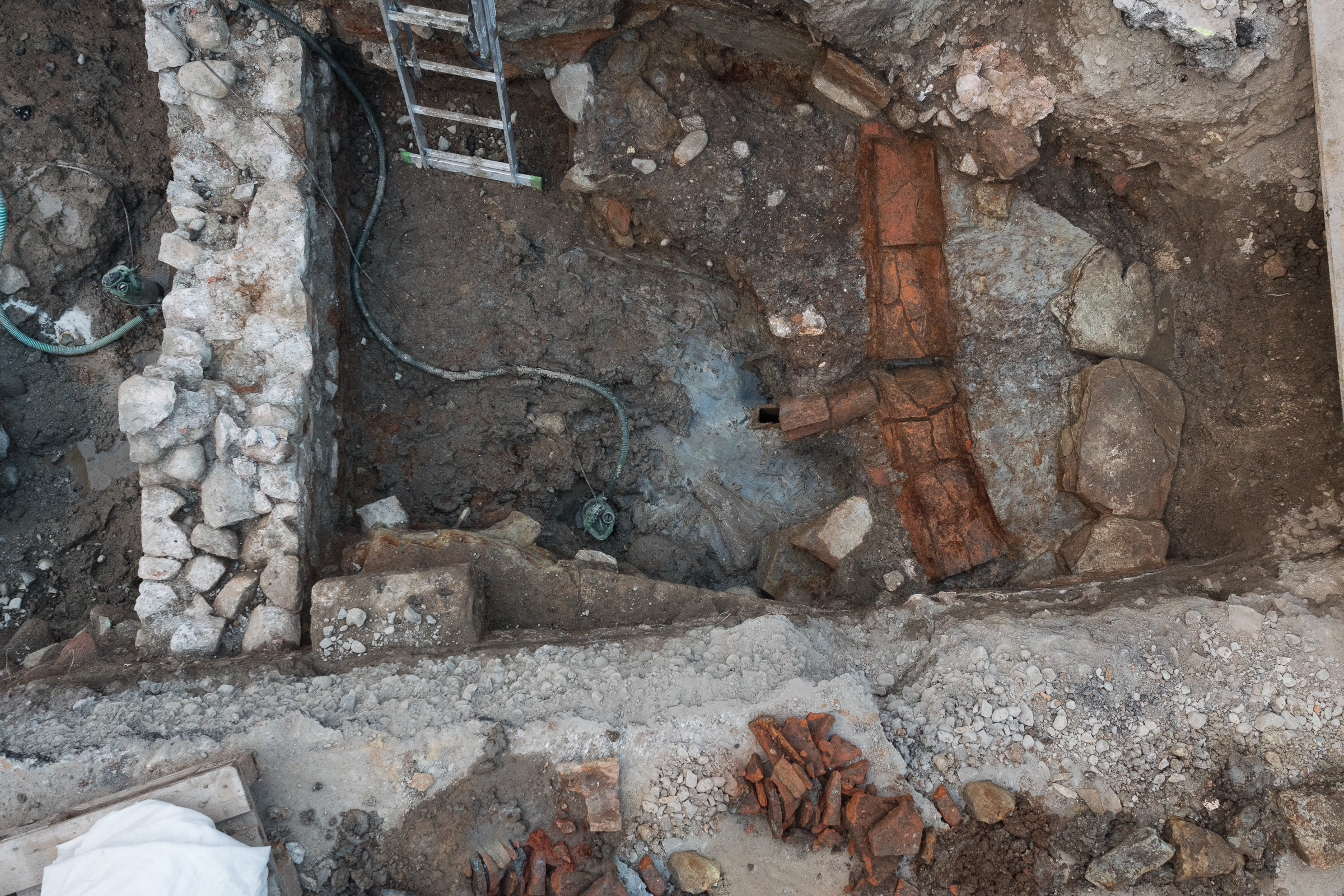 Auf dem heutigen Bild sind die Altarfragemente bereits nicht mehr vor Ort zu sehen, jedoch eine kleine römische Wasserleitung, die zur Platzmitte führte.