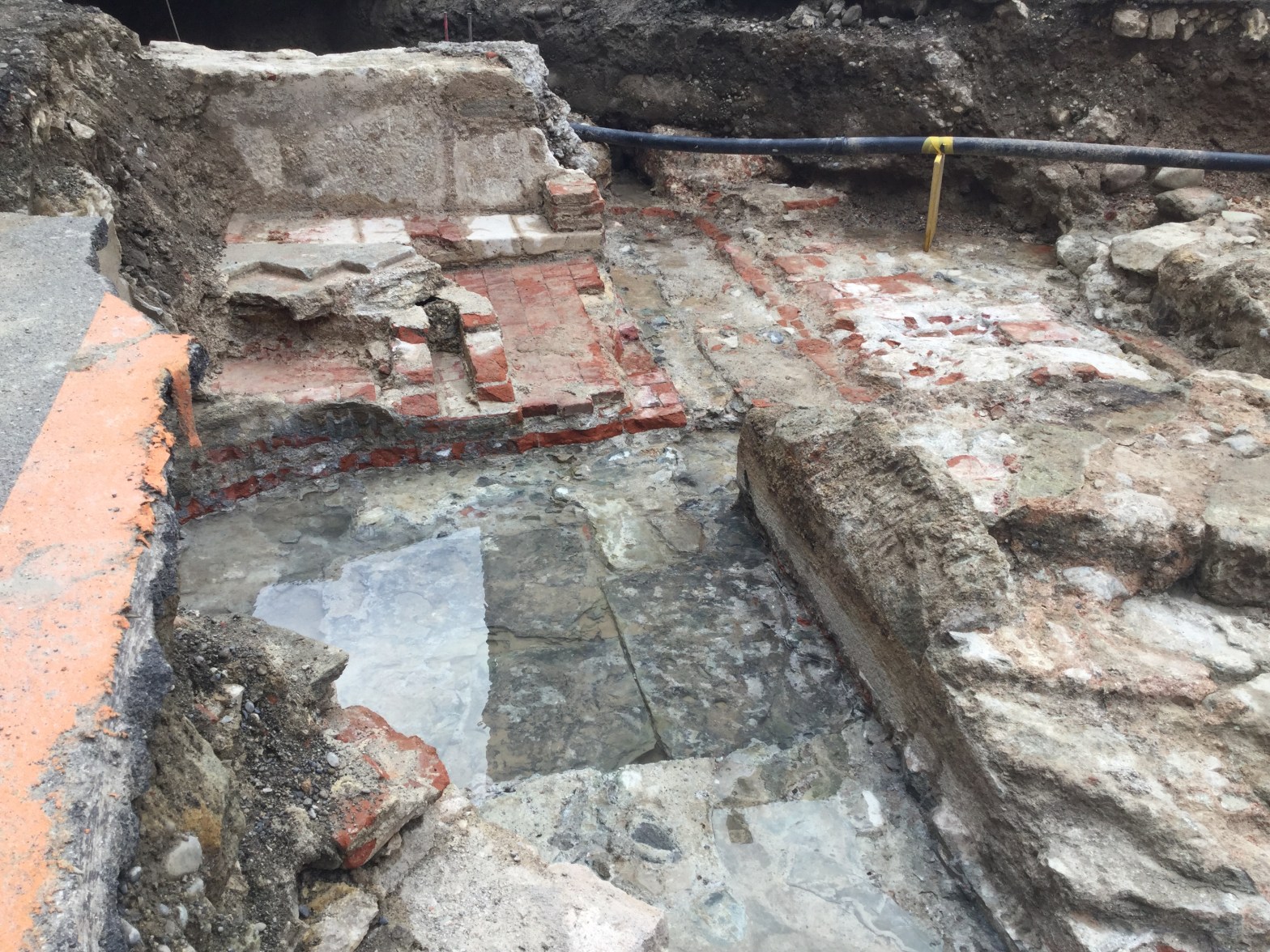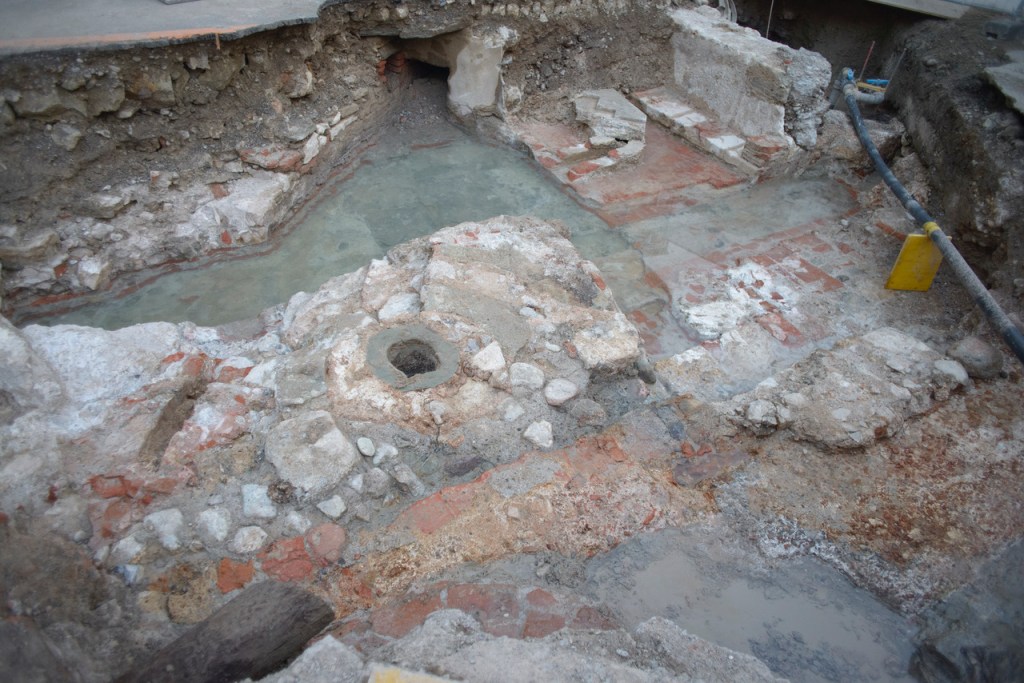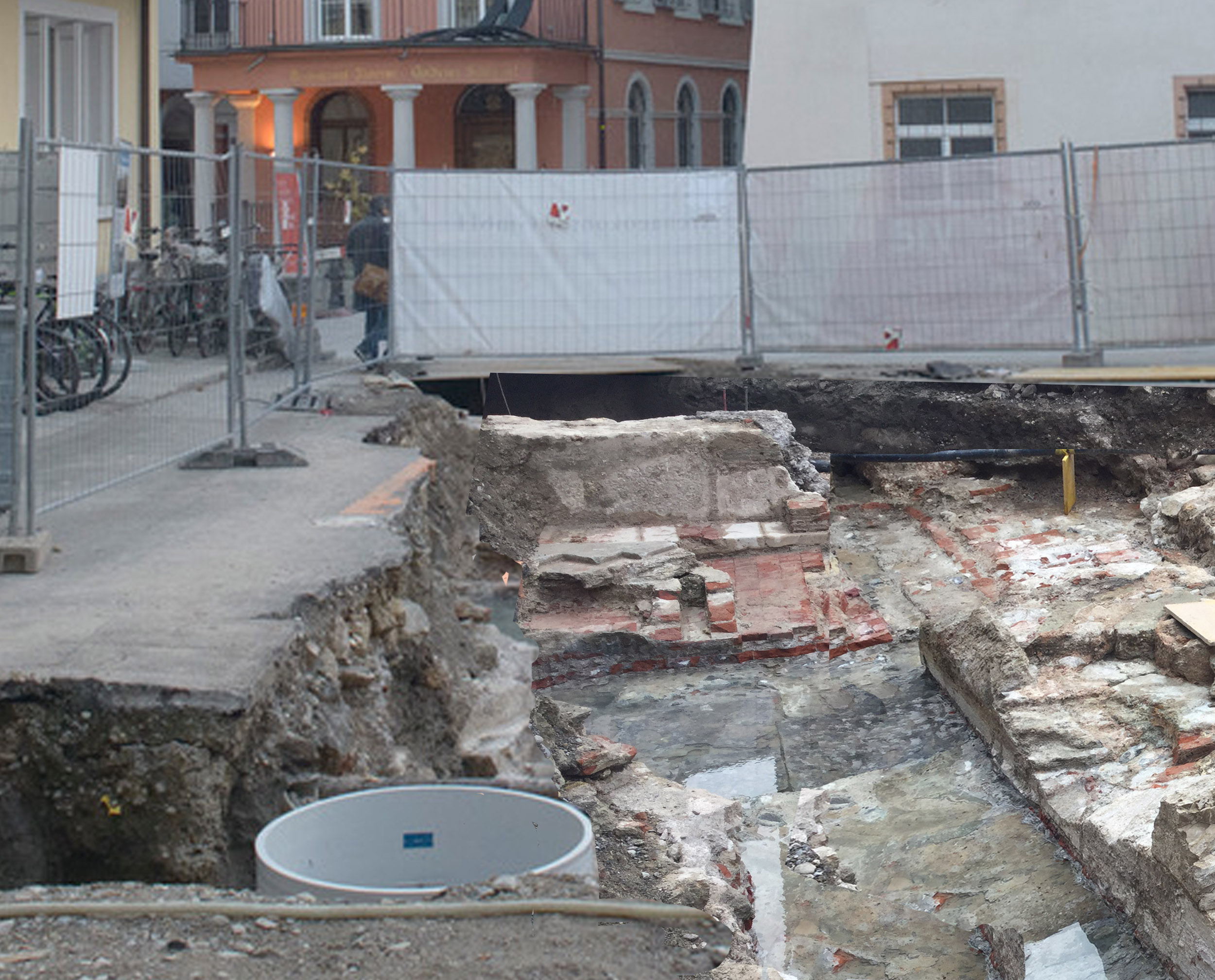 1820 zeichnet der Zürcher Maler Ludwig Vogel präzise Aquarelle vom St. Verenabad und vom Freibad, kurz bevor sie Mitte 19. Jahrhundert zugeschüttet werden. Genau 200 Jahre nach den Zeichnungen, 2020, werden die beiden Bäder partiell wieder freigelegt. Die Überlagerung in der identischen Perspektive des Freibades illustriert die Genauigkeit von Vogels Aquarell wie auch den Erhaltungsstand des Bades.