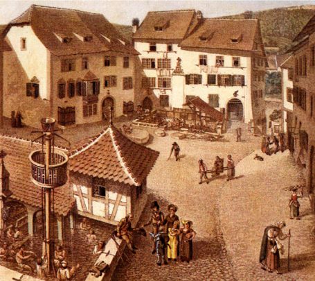 Poggio Bracciolini, der Humanist und bekennende Republikaner im Dienst der römischen Kurie, beschreibt 1416 im siebenseitigen Brief an seine Florentiner Freunde wie „vor aller Augen auf beiden Seiten des Platzes, die Badebecken der Menge und des gewöhnlichen Volkes (liegen), in die Frauen und Männer, junge Burschen und unverheiratete Mädchen und der ganze Bodensatz der Herumtreiber hinabsteigen“. In den von der Natur gespendeten Reichtum. Bracciolini macht es Spass, dem herrlichen Schauspiel zuzusehen und er erkennt darin nichts, was an eine soziale Privilegierung gebunden wäre. Ja, in Baden darf gebadet werden!