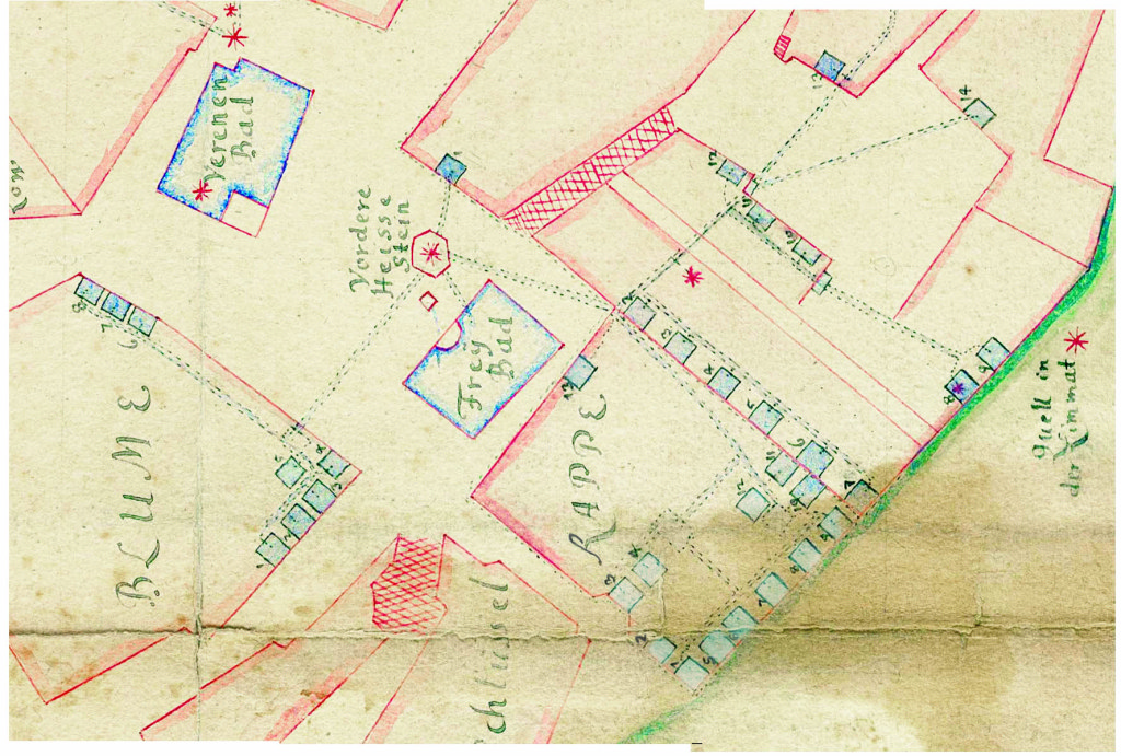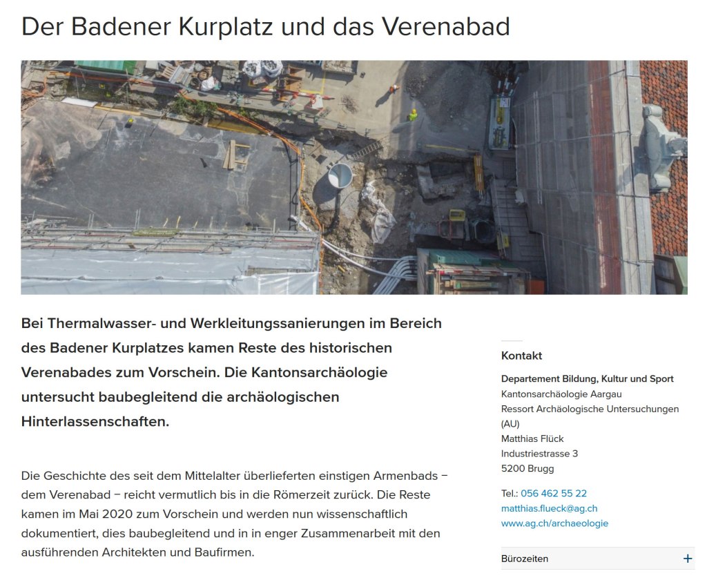 Auf dem heutigen Kurplatz betrieb die Stadt Baden bis 1840 die beiden offenen ca 1.80m tief im Platz eingelassenen Thermalbecken, das Frei- und St. Verenabad. Eingerichtet waren sie – wie sich seit Sommer 2020 belegen lässt – in ursprünglich römischen Bassins. Als öffentliche Gemeinschaftsbäder waren das Verena- und Freibad der einfachen Bevölkerung und Laufkundschaft vorbehalten, denen der Zugang zu den feinen Bäderhotels und Badehöfen verwehrt blieb. Während für das einfache Volk und die Armen zumeist körperliche Leiden Anlass zu einer Badenfahrt waren, schwelgte die Oberschicht aus aller Welt stets in den privaten Bäderhöfen der frivolen Heiterkeit.